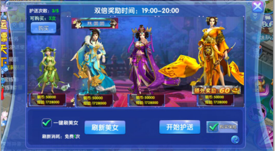每天有免费三次护送美人的机会和两次购买护送次数的机会,美人品质随机刷新,护送不同品质的美人经验获得的奖励也不同。