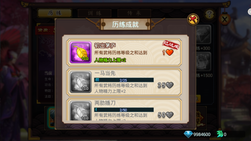 历练可多次历练,到一定的程度,还激活历练成就,历练主要靠不同的道具获得历练值,历练成就每个等级也有相应的人物属性加成。