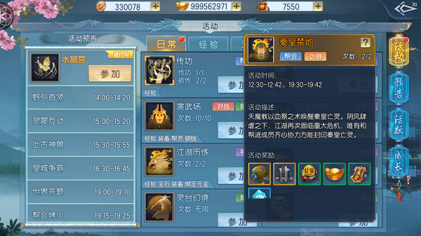 秦皇禁地是《修仙王朝》中参与门槛最低,玩法也最为简单的帮会集体活动。只要在活动开始时间内进入活动界面即可参与,活动没有结束,随时可以进入。
