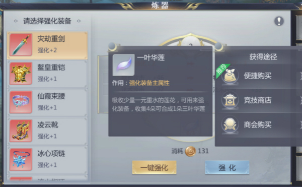 每次强化/突破装备还需要消耗一定数量的货币及材料,装备强化会遵循从低到高来需求不同的强化材料,低级的材料也可以合成高级材料,强化材料还可以通过商会/竞技商店购买。