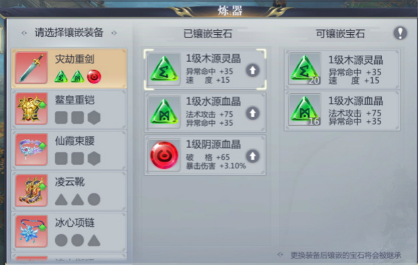 30级以上的装备会开启宝石插槽,宝石插槽数量会根据装备等级阶段开放,一件装备最多拥有4个插槽。宝石的品质由低到高为:白<绿<蓝<紫<橙<红,还会有4种不同形状的宝石(三角形、正方形、圆形、六边形)分别镶嵌到对应插槽里面。而镶嵌宝石的操作只对该装备格子有效,即使更换装备后也不会丢失宝石效果。
