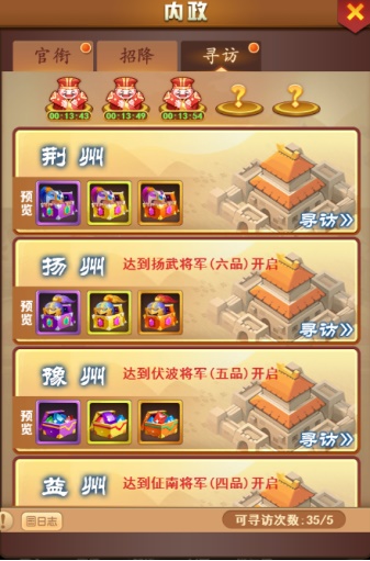 游戏右下角点开内政系统-寻访,玩法开启等级30级,但是这里还是有一个附加的条件:需要达到对应的官职才能解锁各州寻访,也就是说官职越高,接受到的寻访任务选择也越多,不同的州寻访可获得的道具奖励也是不相同。