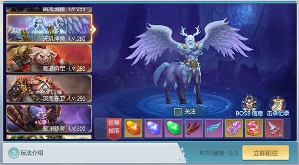 游戏为上仙们提供了不同等级的世界BOSS,上仙们可随意选择BOSS进行挑战,每击杀一次世界BOSS会增加1点疲劳值,达到3点疲劳后,上仙们就不能对世界BOSS造成伤害了,所以上仙们要根据自身实力考虑好击杀哪三个BOSS哦。