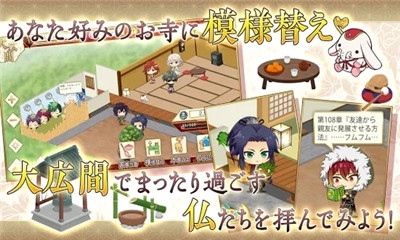 在大厅里,你可以看到佛陀做家务,在寺庙里思考。你可以看到可爱的SD角色四处移动,你可以改变你喜欢的房间,享受有趣的元素!