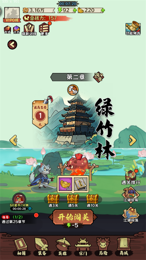 1、闯关、扫荡、挂机、商城抽奖时都有机会得到武功秘籍
