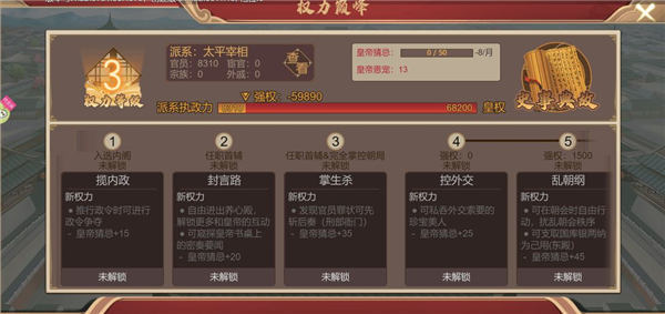 掌控朝局跟十二监的玩法已经是轻车熟路。在收集执政力期间我们先来了解一下权力页面。