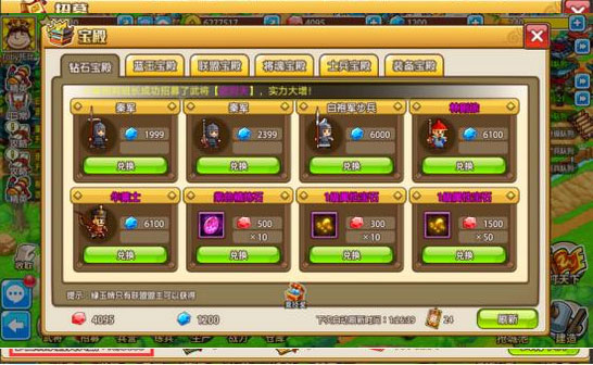 4、在【商城】→【宝殿】内,可以在【联盟宝殿】内使用蓝钻或者黄玉牌购买心仪的武将哟。
