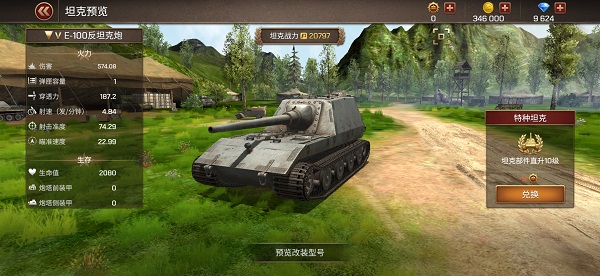 在坦克商城界面点击坦克面板,跳转至坦克预览界面,可以360度旋转视角查看坦克外观,还可以看到这辆坦克全部的详细性能参数以及预览改装型号。经过全面的了解这辆坦克后,就可以决定是否需要拥有这样一辆坦克了。