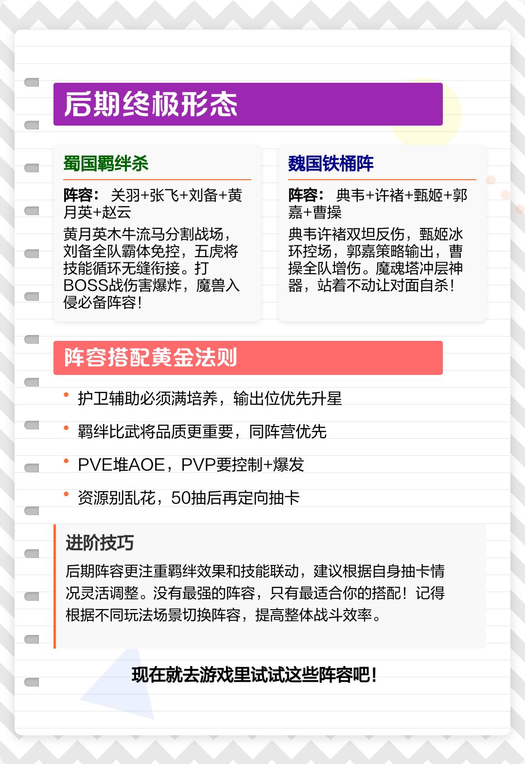 蜀国羁绊杀:关羽+张飞+刘备+黄月英+赵云。黄月英分割战场,刘备全队免控,五虎技能循环,BOSS战/魔兽入侵必备。