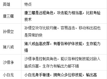 师徒五人根据技能的搭配不同,玩法也多样化,不过从各自的特点来看,孙悟空和猪八戒比较适合新手玩家使用,唐三藏,沙悟净和小白龙则是比较适合技术流高端玩家选择。