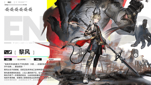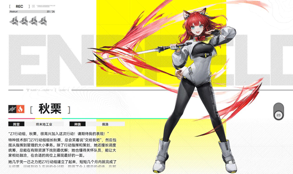 终末地组织的特勤成员,从小跟着母亲学武艺,战斗素养过硬,性格开朗阳光。作为副C角色,用近战刀作战,不用长时间留在战场,就能对周围敌人造成致命伤害,适配多种阵容。
