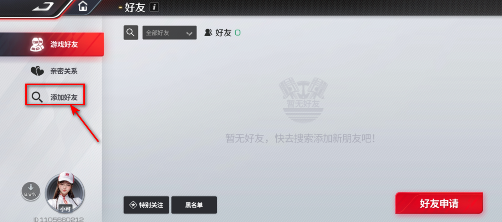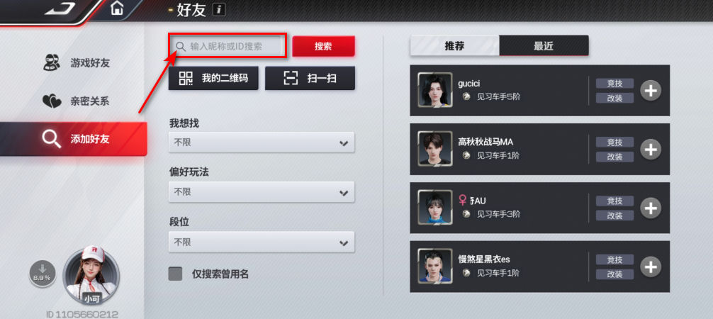 输入昵称或ID搜索,然后点击“+”即可添加了。