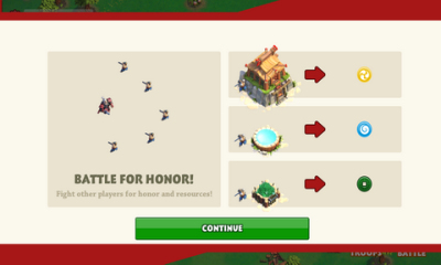 有了士兵之后,就可以点击 Battle 出征了,大地图上会以关卡的形式逐一进行攻克,其实就是去推倒别人的村子,抢钱抢粮抢女人(这个并没有)。目前的最大出征人数是 20 人,点击任意红线外的位置就可以放置士兵,然后他们会自动上去摧毁建筑,当然对方也会展开防御,用箭塔和火炮还击,因为一开始都是比较低级的村庄,防御等级很低,所以经不住我方蝗虫一般的围攻,攻下主城之后就宣告胜利了。