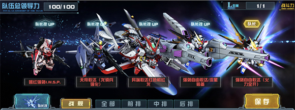 搭配思路:这两队SEED系列机体队伍搭配的区别主要在典藏机体的选择上。若指挥官选择将强袭自由敢达(火力全开)加入浮游炮系列队伍,则选择异端敢达金色机天照作为队长;若选择将异端敢达金色机天照加入格斗机体队伍,则选择强袭自由敢达(火力全开)作为队长。