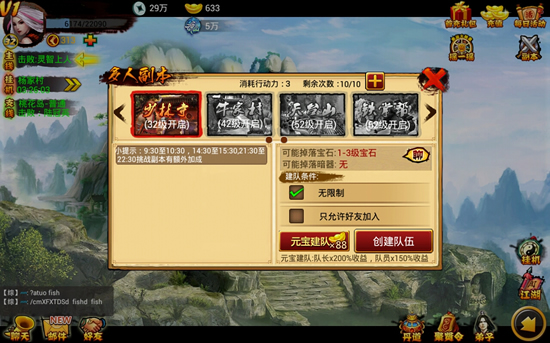 到了32级后,开了副本,找几个好友组队打吧,作为屌丝,我肯定在规定时间内打,享受个加成;大R来搞个元宝队吧,让本屌蹭一蹭吧
