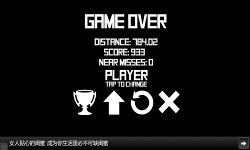 小编一不小心就挂掉了,撞到墙上的感觉有点不好受,似乎是被撞残了的感觉。点击X退出游戏,点击奖杯查看排行,点击圆圈重新开始,那个箭头,如果你好意思你就点吧。。。那个是上传你的成绩。。