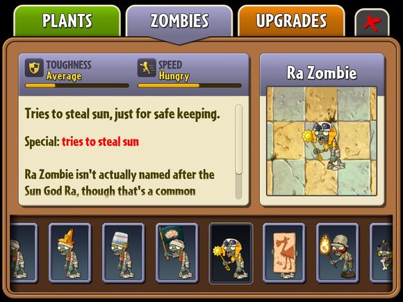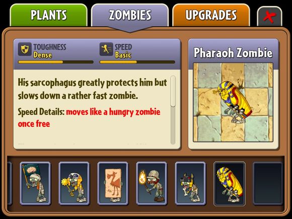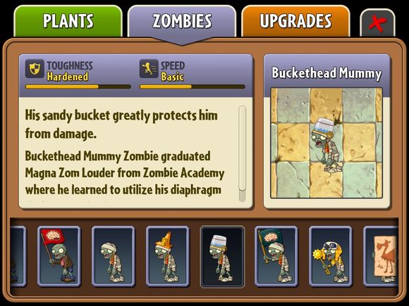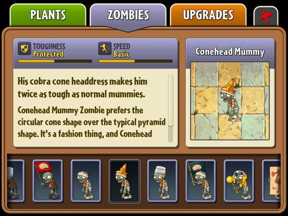 他的眼镜蛇头巾路障让他有普通的木乃伊(木乃伊僵尸)两倍的防御力。相比独特的尖形,他更喜欢圆形的路障。那是一件很潮的事,他总是引领潮流!