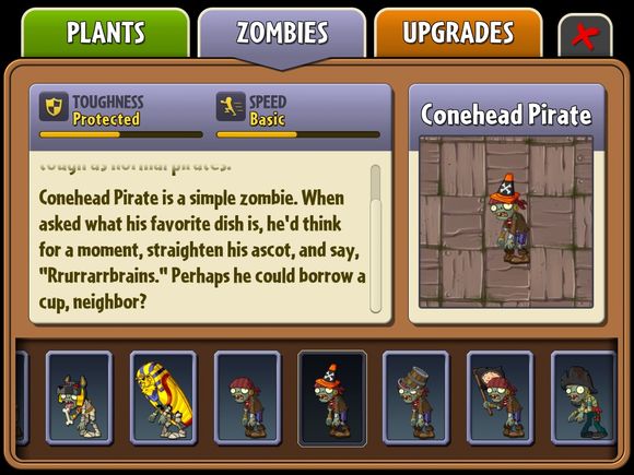 路障头海盗是个简单的僵尸。当问到他最喜欢的一盘食物是什么,他想了一会,摆正了自己的领带,然后说:"拌脑子也许他可以向你借个杯子,邻居。”
