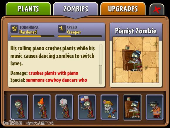 钢琴家僵尸是一名很有文艺范的僵尸,这么多的僵尸都是暴力狂,除了它。是不是每一步作品都有一个文艺范?上一次是?猫王?