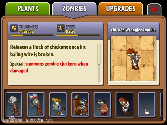 特殊:释放僵尸鸡连锁闪电当受到攻击的时候!僵尸身上带个鸡笼子``笼子坏后出来大量速度飞快的公鸡``地刺秒杀攻击``芦苇闪电也秒杀攻击(可以一次秒一堆`连锁闪电嘛)