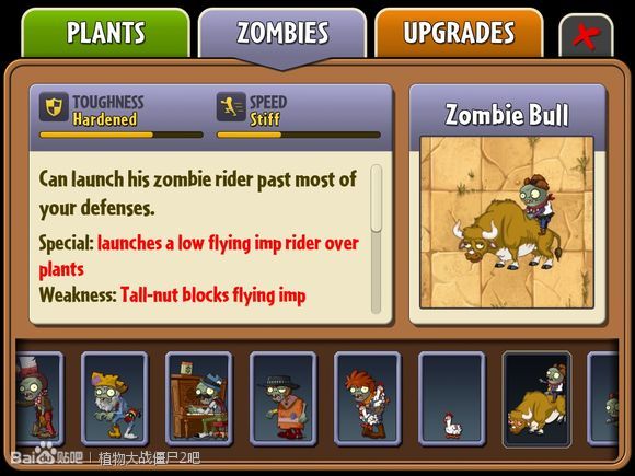这僵尸也是最恶心的僵尸``首先机械牛特别抗揍`椰子炮威力最大了吧`得两发才能干死牛``牛受到伤害后会暴走`移动速度增加``当牛跑到最右边的植物后``会把身上的牛仔僵尸甩到左边`破解方法``被甩下的牛仔不可被坚果当到``但是可以被大坚果阻挡``因为大坚果高```发现此僵尸``第一时间造大坚果`如果大坚果CD`使用肥料激活你的植物把他秒杀掉吧``否则后果非常严重``地刺对这牛也有不错的伤害``