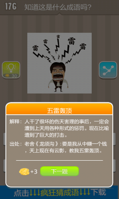 你猜对了吗?天打五雷轰的意思就是人干了很坏的伤天害理的事后,一定会遭到上天用各种形式的惩罚。现在比喻遭到了巨大的打击。