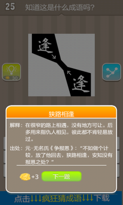 你猜对了吗?在很窄的路上相遇,没有地方可让。后多用来指仇人相见,彼此都不肯轻易放过。