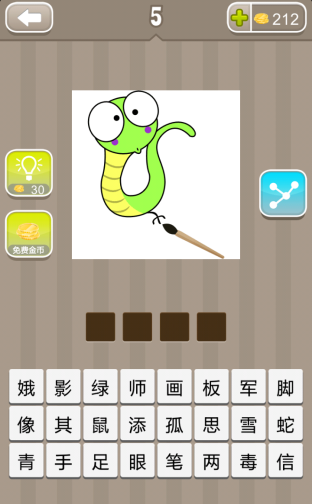 疯狂猜成语V1.3.5版本的发布,游戏加入了更多的图片关卡。而下面小编将为你解析图片为一条青色的蛇和一支毛笔。而在蛇腹部有一只脚,答案为四个字成语,玩家你知道答案么!