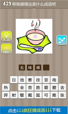 最新更新疯狂猜成语有如下图这样一幅图片。亮绿色的碗垫上放有红色的碗,碗里有甜、苦、辣、咸,旁边有个勺子上面写有酸是什么成语呢?
