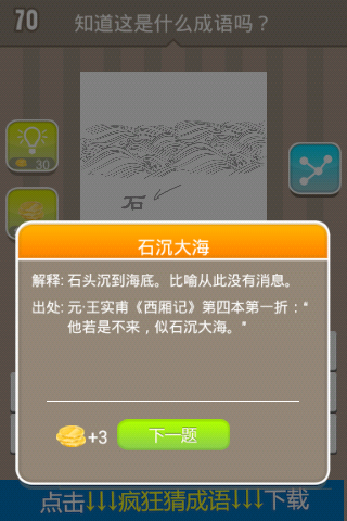这道题目的关卡答案就是:石沉大海,(因为石头沉下去看不见了,所以才是石沉大海,海面等于大海呦~!所以,要箭头标注。)