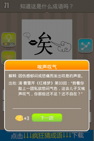 这是疯狂猜成语里的一道关卡,一个唉字,比较奇特的是口字旁是一个黑色嘴唇样子的偏旁哦,似乎还在说话,还有呼出一口气,答案是什么?