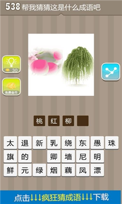疯狂猜成语最近更新的关卡有几张很唯美的图片哟,小编给你带来其中的一张如图是不是很好看?红色的桃子和绿色的柳树是什么成语呢?