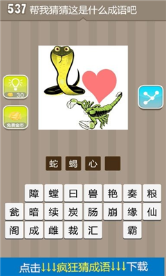 如下图是最新更新的疯狂猜成语的其中一道关卡。小编看蛮多友友们不会,特意拿来分享一下,疯狂猜成语中一条蛇一颗红心一只蝎子是什么成语,希望可以帮助大家通关。