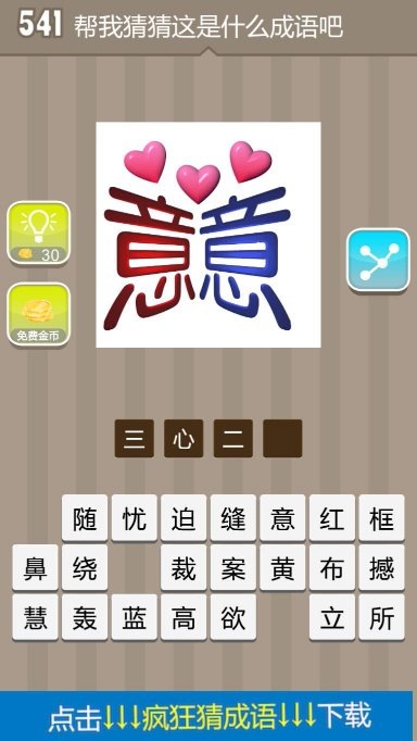疯狂猜成语彩图越来越多,有这么一个图三颗粉色心下面有一个红色的意和一个蓝色的意是什么成语呢?答案很简单你猜到了吗?