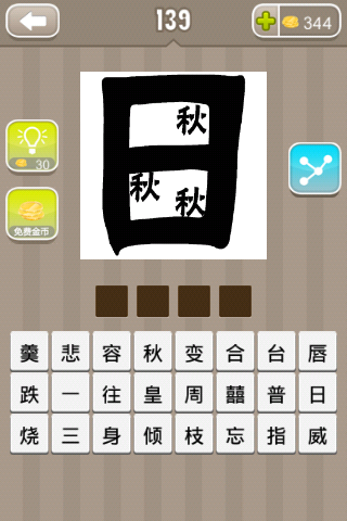 这是疯狂猜成语新版里的关卡呦,友友们入手之后觉得难度有增加吗?比如下图,一个大大的日字里面有三个小小的秋字,大家知道它的答案是什么吗?