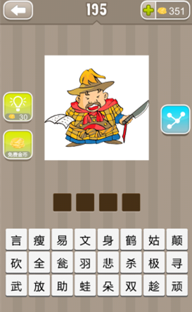 疯狂猜成语游戏非常考验玩家的思维能力。有这样一张图片关卡,图片为一名身穿黄色盔甲的官兵,而他的一只手拿着刀,而另一只手拿着一本书。图片看似很难,但是发挥玩家的思维可以很快答题,具体如下。