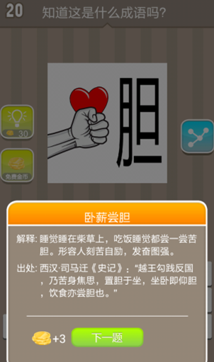 疯狂猜成语有多张关卡红心和胆字的图片关卡,而下面小编解析的为它们的组合图片关卡,具体图片为一只手上一个红心和一个胆字,图片如下: