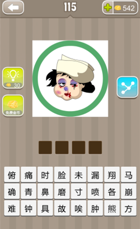 疯狂猜成语有这样一张奇怪的人脸图片关卡,图片为一个带着白色头巾的臃肿人脸,而他的颜色和鼻子为紫色,嘴角还有血,玩家你知道答案么?具体图片如下: