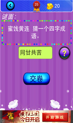这是一款新的猜成语系列的游戏,在这款游戏里目前小编还没有发现图片,都是汉字,然后从中得出答案,比如下面这道关卡,四个字蜜饯黄连,猜一个四字成语答案,你知道吗?