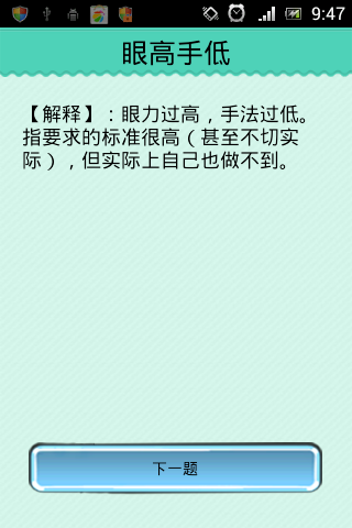 【释义】:一:最初眼高手低指做人眼界要开阔,目标要远大,做事情则要低下手来,脚踏实地,踏踏实实的做工作。二:现在多解释为,要求的标准很高(甚至不切实际),但实际上自己也做不到。说白了就是期望值过高,以至于不切实际,比如想娶那谁谁谁。