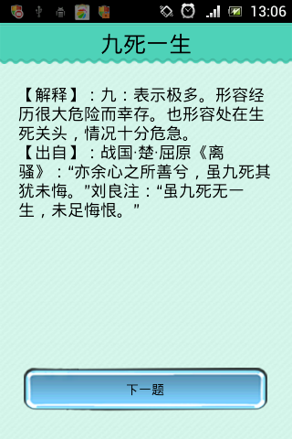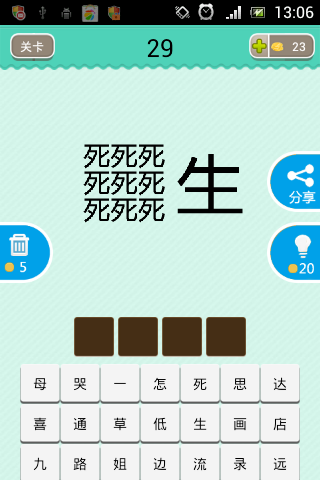 这道关卡的正确答案就是:九死一生,(九个死字等于九死,一个生字就是一生,答案就是九死一生。)