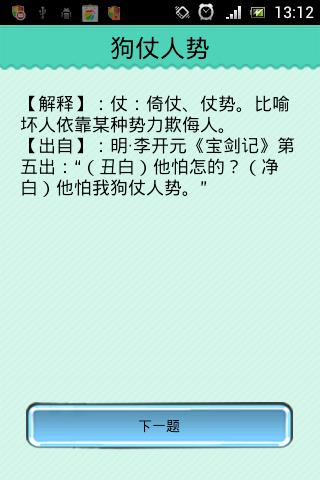 它的正确答案有点难猜,就是:狗仗人势,(单人旁等于人,旁边的类似于犬字,所以,整道题目的答案就是狗仗人势。)