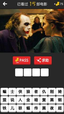 电影超人是一款一电影为题材内容的猜图游戏,游戏中这样一张图片难度较大。图片为一个白色脸嘴巴裂开的外国男人,他望着一个金发女人,答案为四个字电影。具体如图:
