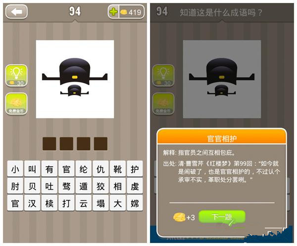 以上就是小编带给你的看图猜成语两顶官帽答案是什么_看图猜成语之官官相护,以上是我机小编带给你的图文详解,喜欢的玩家继续关注我机网攻略,祝你游戏愉快!