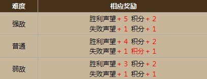 可选择强敌、中敌、弱敌三种不同类型的对手,声望奖励有区别,积分没有区别