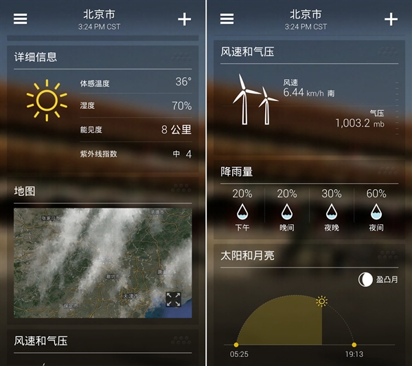 除了基本的天气时报之外,应用现在也提供更多的天气数据,比如5天或10天内的天气预报,体感温度、湿度、能见度、紫外线指数,风俗和气压,降雨量,日出日落时间,可以说与天气相关的数据已经非常丰富了。另外,该应用还提供了多种尺寸的插件,以及可选的常驻状态栏天气通知。