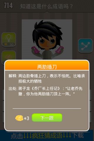 好了,不废话啦,这道关卡的正确答案就是:两肋插刀,好吧,我们一起看图,两把刀确实插在肋骨那里,所以答案就是两肋插刀。
