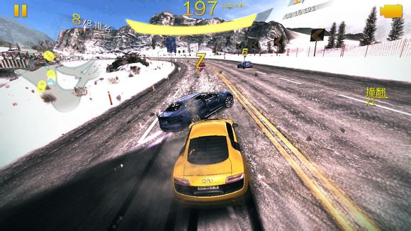 A7的撞车强调顶挤和火线喷射,也就是说你如果没有足够放出火线的氮气量,就把对手挤到墙边再蹭他几秒,然后成功把对手废掉了。A8里这一招虽然也存在,但由于这次氮气撞车变的异常简单,加之赛道环境变的更加多变,因此这一招也变的并不常用。我们在这里首推的方法是侧后方----将你的车绕到对手车辆的侧后方,然后打方向去顶挤它。