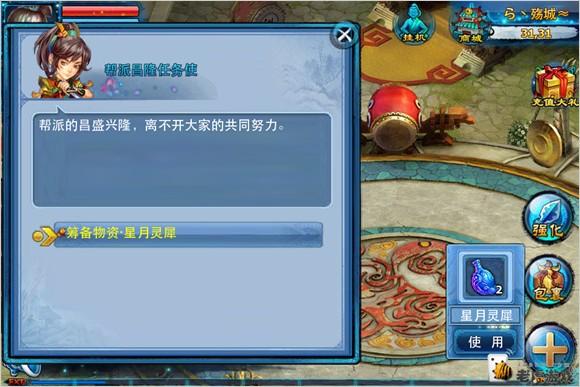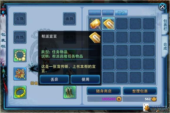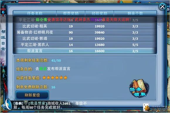 至此,帮派昌隆任务基本就介绍结束了,按任务困难程度来说,比武切磋可谓是非R的噩梦,其次是筹备物资,再是平定江湖,如果有帮派宣言的话,不用想了,果断领取!!