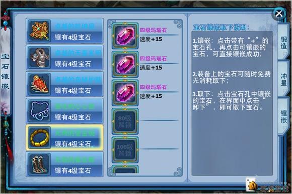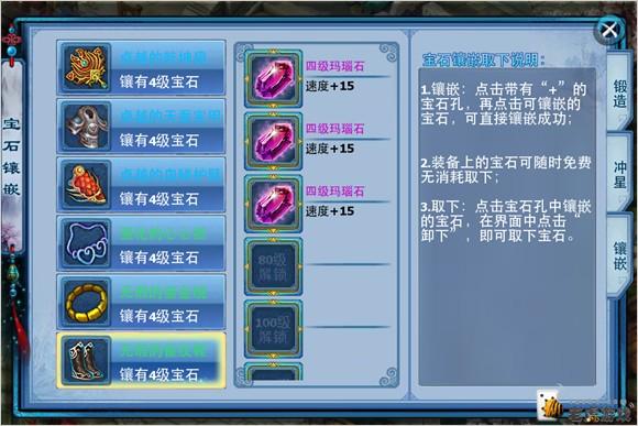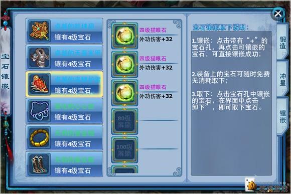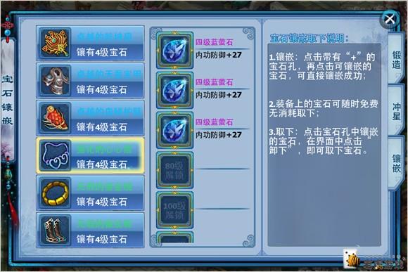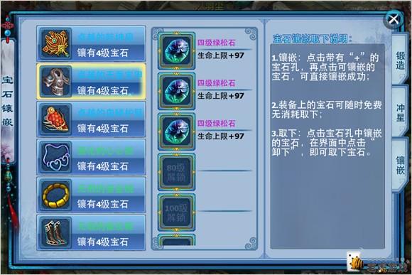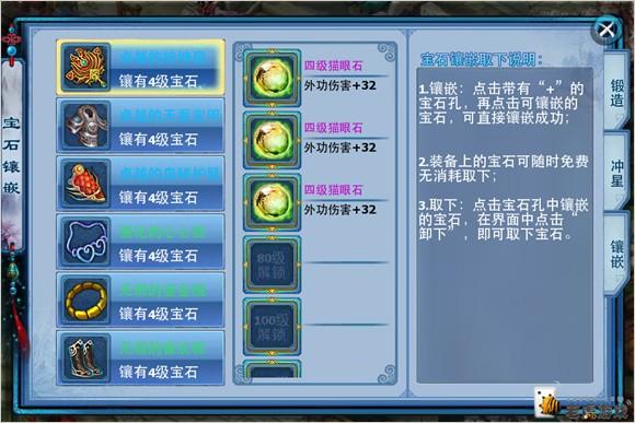 而武器及护肩的打法就比较简单了,打满增加外功伤害的猫眼石就OK了,衣服满松绿石是必须的,不然血太少也跟不上成长,项链的石头选择有两个方向,一是内功防御的蓝萤石,二是外功防御的金刚石,这里想家推荐大家打蓝萤石,因为不管是单P还是群P,打人或者打怪,一般比较受威胁的是对方的宠物以及侠客的群体法攻,当然这也是想家的一面之词,至于打内功还是打外功防御还是看个人的喜好选择。